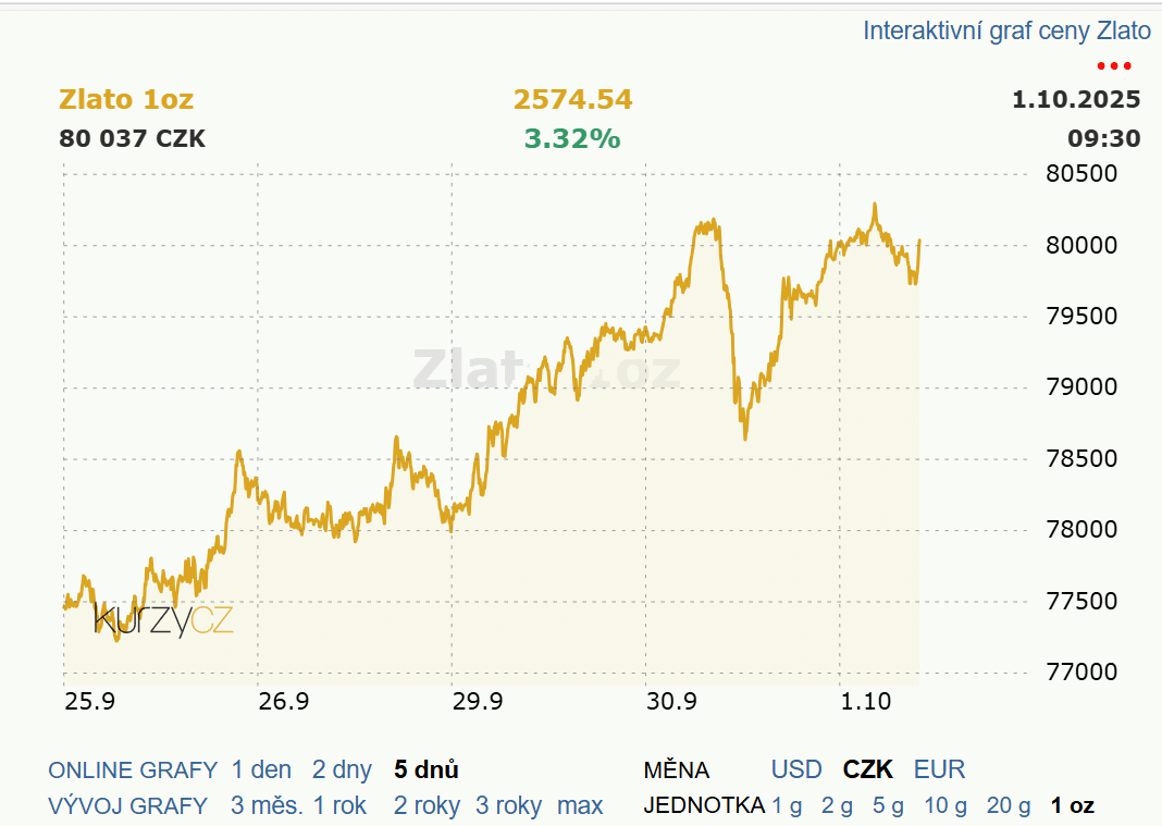 Za tímto prudkým růstem stojí nejistota ve Spojených státech, kde hrozí tzv. shutdown – tedy omezení chodu federální vlády, pokud se politické strany nedohodnou na financování. V nejistých obdobích se investoři tradičně uchylují ke zlatu jako k bezpečnému útočišti.